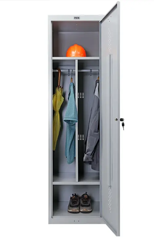 Шкаф комплектуется вертикальной перегородкой, двумя полками (для головных уборов и для обуви), а также круглой перекладиной с крючками для развешивания одежды.